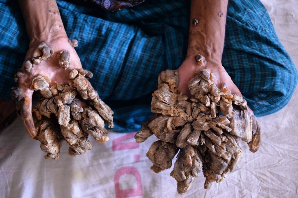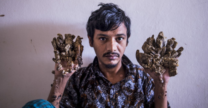 Este bangladesí de 28 años padece epidermodisplasia verruciforme, una extraña enfermedad genética que hace que sus extremidades se llenen de verrugas que le han hecho la vida imposible, al punto que ha pedido que le amputen las manos, según señala Daily Mail.