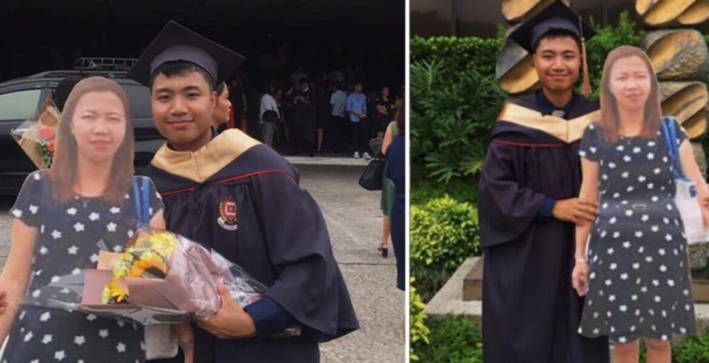 Así es ya que él quiso llevar a su graduación la foto tamaño real de su mamá que había fallecido y no pudo asistir a la ceremonia.