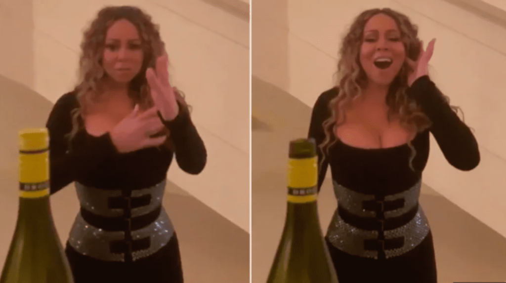 Mariah se concentró y se tapó un oído como si buscara el tono para cantar. Acto seguido un pequeño grito que le sirvió para completar el desafío: destapó la botella sin tocarla. El agudo sonido hizo volar el tapón y dejó a todos impactados.