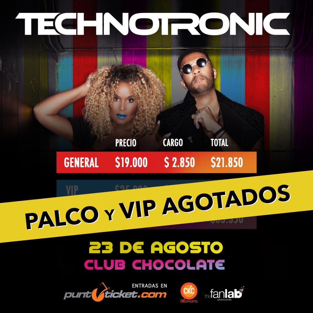 Ya en tierra derecha para el regreso del dúo líder del music dance y house ,Technotronic, los fans han adquirido todas las entradas disponibles en Vip y Palco. La fiesta es el viernes 23 de agosto en Club Chocolate. Los tickets generales siguen a la venta en Puntoticket.com.