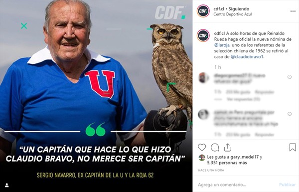 El CDF compartió una imagen de Sergio Navarro, el histórico capitán de la roja del 62, que indica que «un capitán que hace lo que hizo Claudio Bravo, no merece llevar la jineta«.