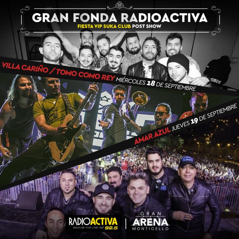 La mejor música y ambiente para estas Fiestas Patrias estarán en Gran Arena Monticello, ya que se realizará la Fonda Radioactiva. El 18 de septiembre estarán Villa Cariño y Tomo Como Rey y el 19 animarán la jornada Amar Azul y los Djs Pape Salazar y Spider. Ambos días finalizarán con una fiesta VIP en Suka Club.