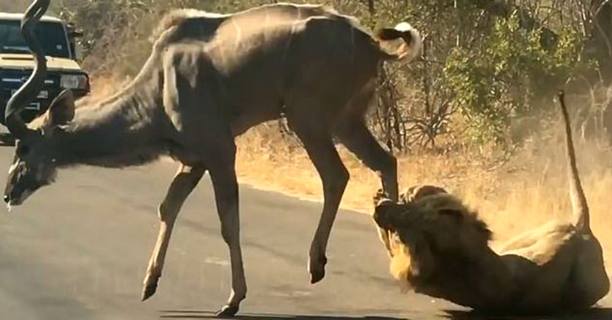 “El león logró tirar al poderoso antílope macho al suelo, justo fuera de la carretera, pero éste utilizó sus patas para seguir luchando, hasta que al final dejó de patear: el pobre animalito realmente batalló duro”, dijo una de las testigos que grabó desde su auto la impresionante escena.