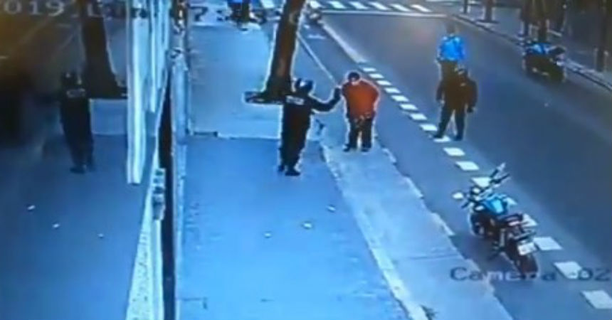 El hecho fue registrado por las cámaras de seguridad del barrio porteño y rápidamente se viralizaron en las redes sociales, dada la desmedida violencia utilizada por el uniformado. En las imágenes se ve como el policía se acerca a la víctima y lo patea fuertemente, lo que provocó que cayera desplomado de espaldas.