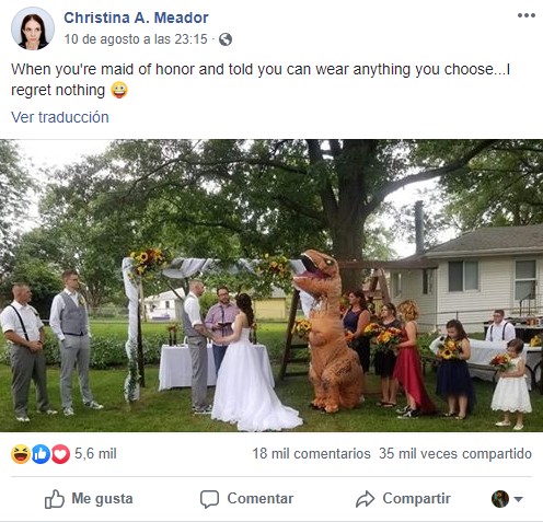En el camino a casa, el día después de la boda, Christina compartió una foto de ella con el disfraz de dinosaurio en Facebook y escribió: «Cuando eres una dama de honor y te dicen que puedes usar lo que elijas… no me arrepiento de nada».