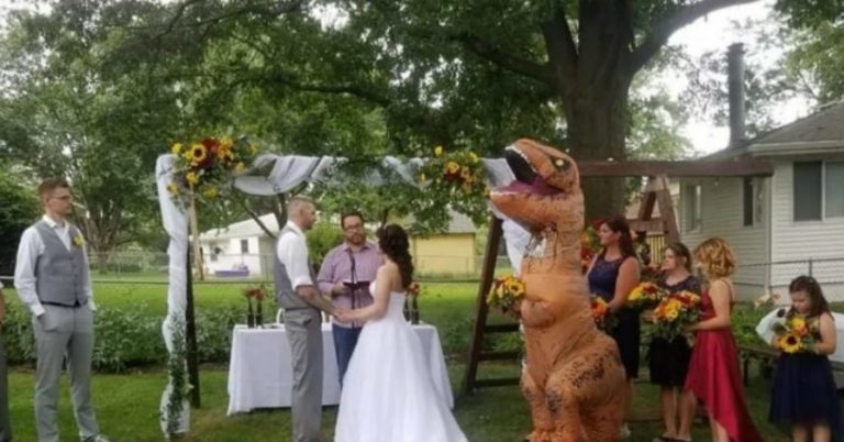 Dama de honor llegó a la boda de su hermana disfrazada de dinosaurio
