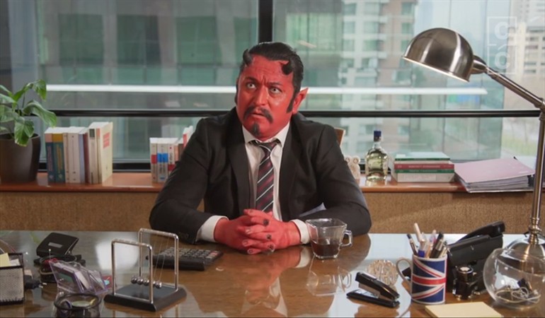 Y su protagonista es nada más y nada menos que Daniel Alcaíno, quien personificado como satanás responde ante la oferta de dos vendedores que pretenden ofrecerle el modelo de pensiones local.