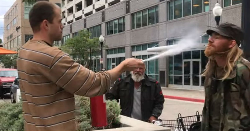 El fumador instó al locatario a mostrarle la ley que prohibía fumar en ese lugar. «Te mostraré la ley», le espetó el propietario del local, «voy a apagar el cigarro. ¡Aquí no se puede fumar!», y acto seguido cogió un extintor y roció la cara del hombre ante la estupefacción del resto de personas que presencian la escena.