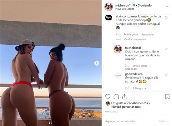 Todo partió cuando Michelson compartió en Instagram una foto de ella junto a una amiga, publicación donde ambas aparecen solo con una diminuta tanga. En ella la exchica reality aseguró que su amiga tiene «el mejor ‘culito’ de Chile», a lo que un seguidor le respondió que en realidad Geri Hoops ostenta ese sitial.