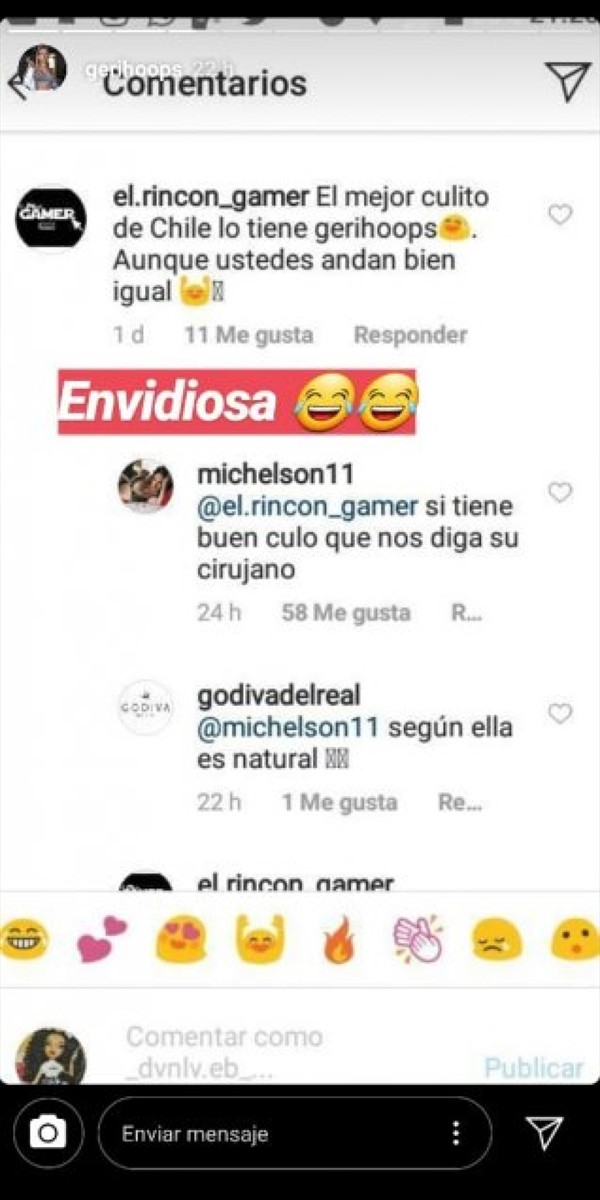 Estas palabras llegaron a Hoops, quien sacó un pantallazo del comentario de Michelson y lo compartió en sus Stories, tildando a la exestudiante de Derecho de «envidiosa».