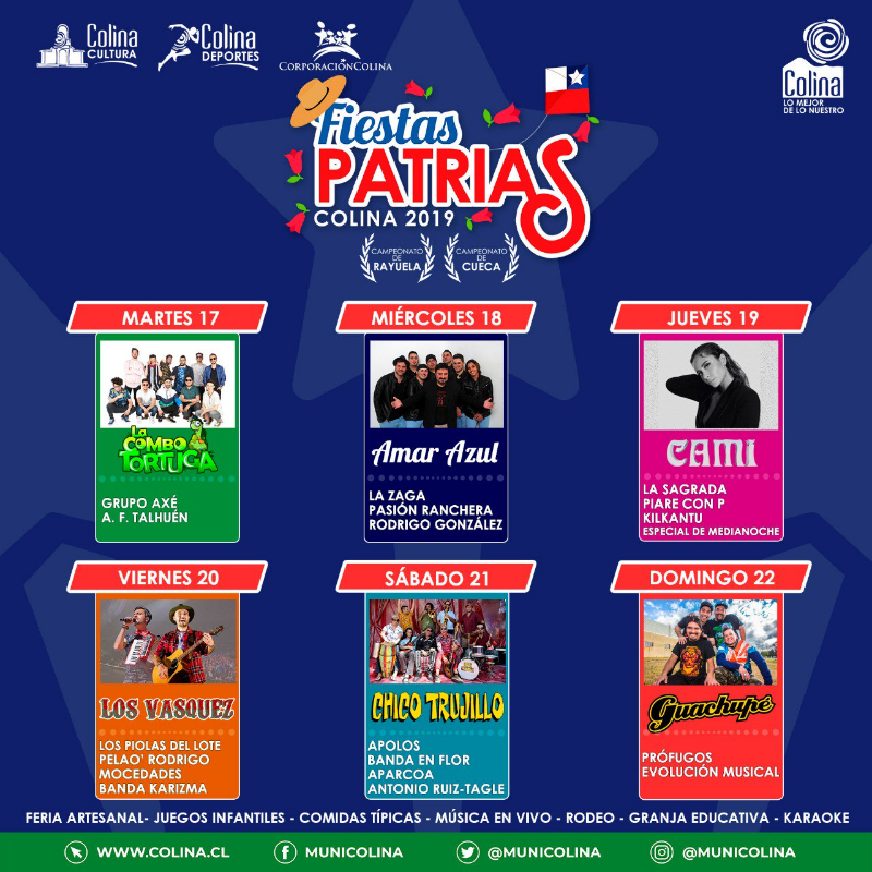 Colina se prepara para celebrar Fiestas Patrias con todo ya que el festejo durará seis y contará con la presencia de destacados artistas nacionales. Así es porque la cosa parte este martes martes 17 hasta el domingo 22 de setiembre.