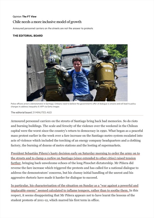 Concluyendo que «Piñera ha entendido correctamente la necesidad de hacer que Chile sea más atractivo para los inversores extranjeros y de impulsar el crecimiento económico (…) Si se quiere preservar la estabilidad duramente ganada de su país, ahora debería mostrar una sensibilidad similar hacia los chilenos menos afortunados«.