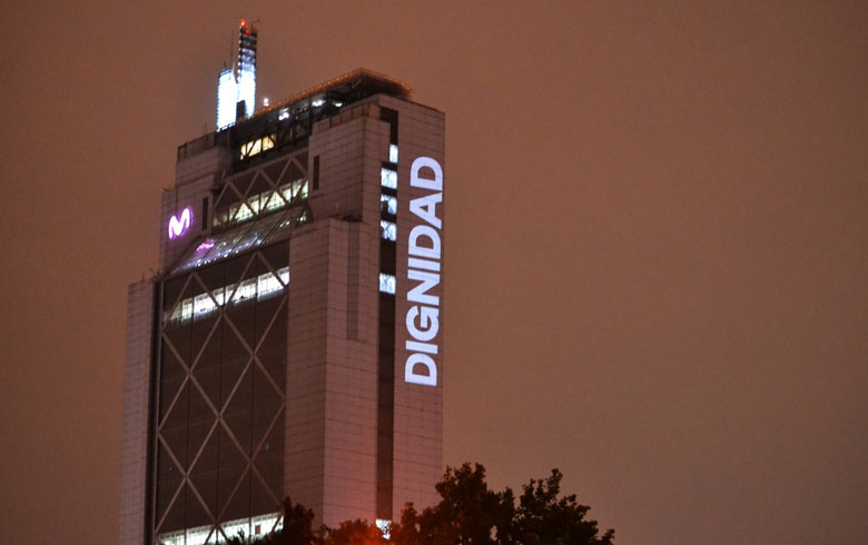 El edificio de Telefónica ubicado en Avenida Providencia las últimas noches ha lucido distinta frases que han llamado la atención de muchos santiaguinos, sobre todo en medio de la crisis social que vive el país.