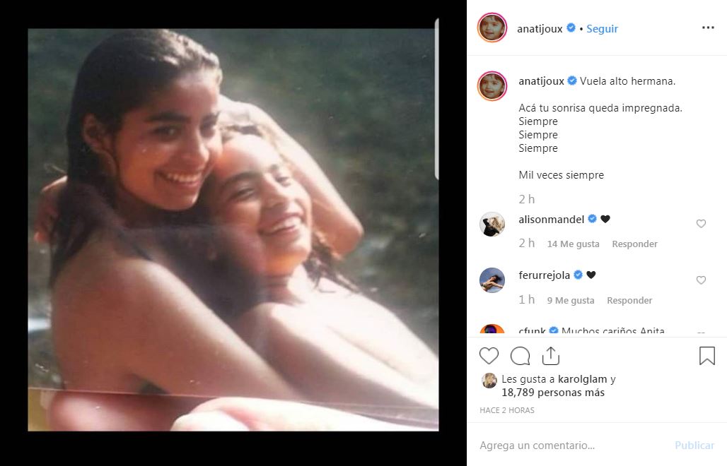 La artista publicó una imagen junto a su hermana Tania cuando ambas tenían 11 y 18 años, respectivamente con el mensaje «Vuela alto hermana. Acá tu sonrisa queda impregnada. Siempre. Siempre. Siempre. Mil veces siempre».