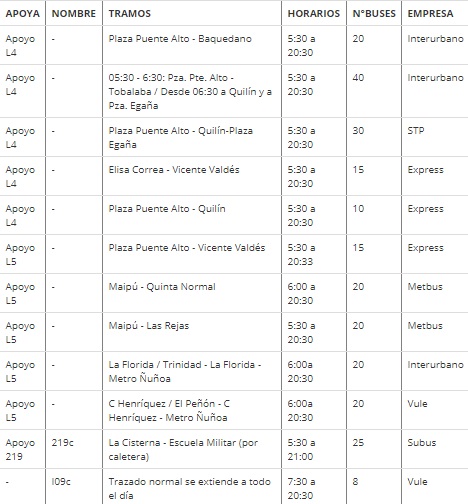 Habrá 243 buses adicionales para reforzar la operación. Serán en total 12 servicios que permitirán a los usuarios de las comunas de Puente Alto, La Florida, La Cisterna y Maipú, tener mayores alternativas para llegar a las estaciones de Metro que están operando.