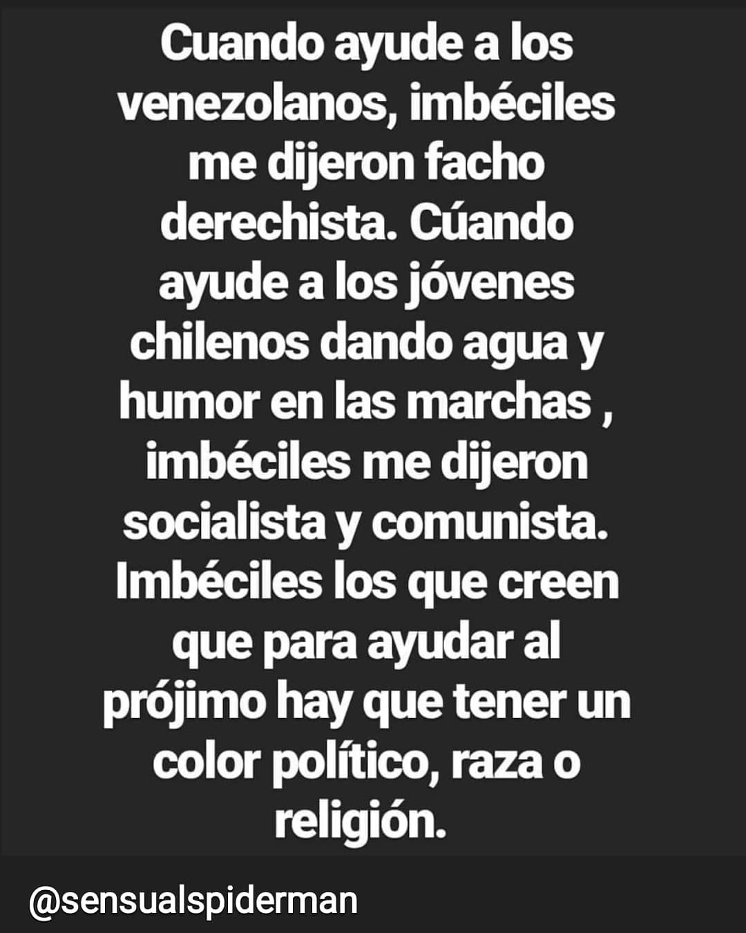 Con el mensaje además escribió una potente reflexión en la descripción de la imagen. «Me acuerdo cuando a fui a la frontera de Perú con Chile en Tacna a bailar para los niños refugiados de Venezuela, por el día del niño, y los mismos venezolanos de acá en Santiago, me decían que no necesitaban nada (…) Me acuerdo cuando fui en invierno a regalar abrigo a la gente en situación de calle, me decían que estoy apoyando a los borrachos y vagos. Ahora llevo baile humor a las marchas y me dicen comunista saqueador y vándalo», fue parte de lo que escribió Sensual Spiderman.