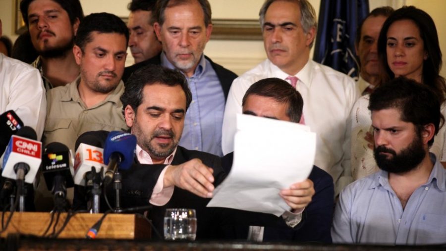 Luego de largas negociaciones entre la mayoría de los partidos que integran el Congreso Nacional, se anunció durante la madrugada de este viernes 15 de noviembre un acuerdo de reforma constitucional para que se hagan plebiscitos que consulten, desde cero y en una hoja en blanco, el proceso para nueva Constitución y su mecanismo de construcción: a través de una Asamblea Constituyente (denominada Convención Constitucional) o de una Convención Mixta Constitucional.Fue el presidente del Senado, Jaime Quintana, quien en compañía del resto de parlamentarios dio a conocer los puntos del acuerdo, denominado «Acuerdo por la Paz Social y la Nueva Constitución».