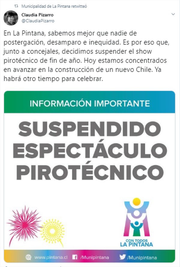 Claudia Pizarro, alcaldesa de La Pintana, infirmó a través de redes sociales la suspensión de los fuegos artificiales para la celebración del Ano Nuevo 2020.