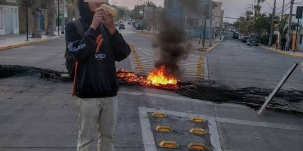 En las redes sociales ha empezado a circular la foto de un joven que está comiendo un completo al lado de una barricada.