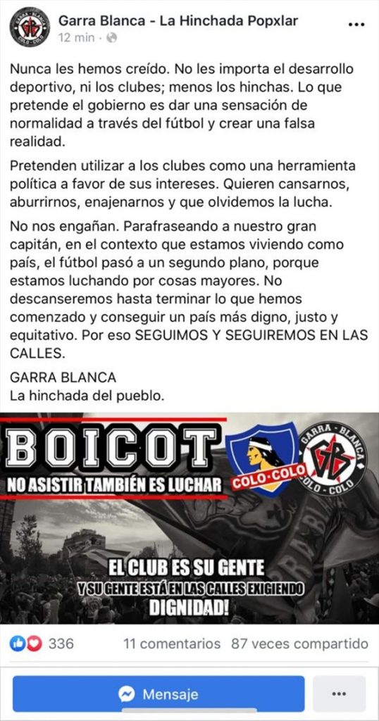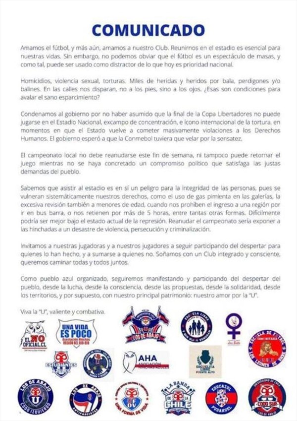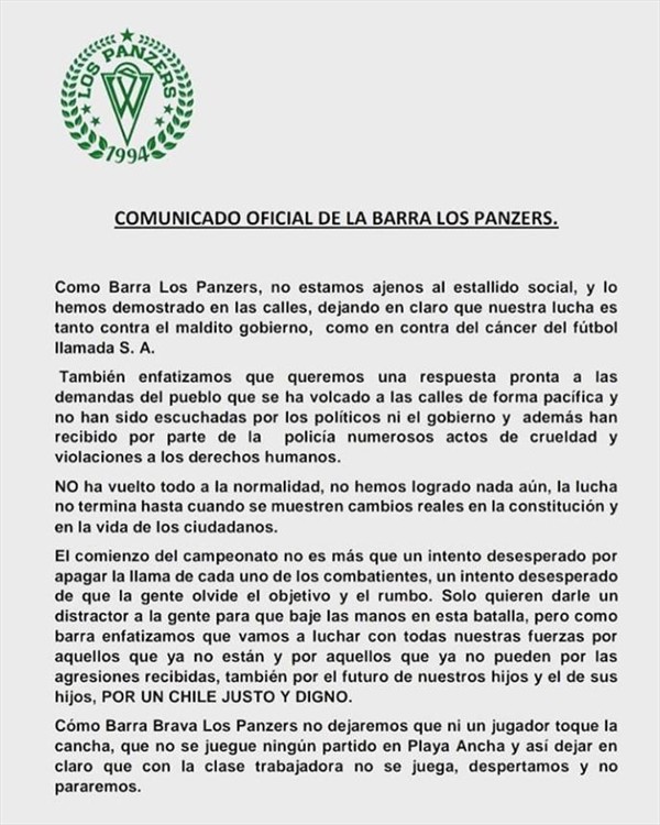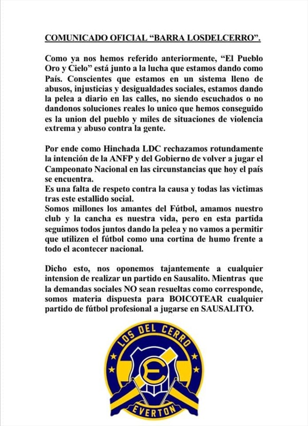 Desde la región de Valparaíso, «Los Del Cerro», la facción ruletera hizo un llamado a no asistir a la cancha. «Mientras las demandas sociales no sean resueltas, somos materia dispuesta para boicotear cualquier partido de fútbol profesional a jugarse en Sausalito».