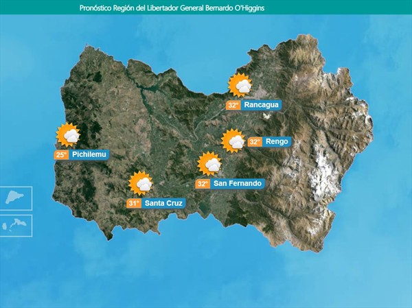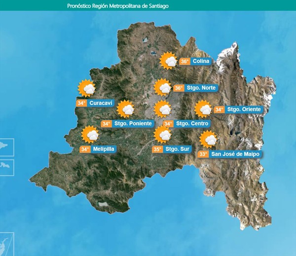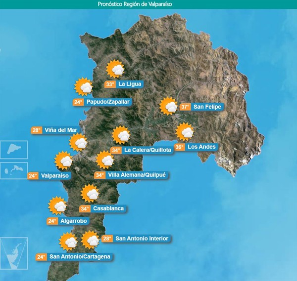 En San Felipe, en la región de Valparaíso, llegarán a los 37°C hoy, mientras que en la zona norte de Santiago se esperan hasta 36°C.