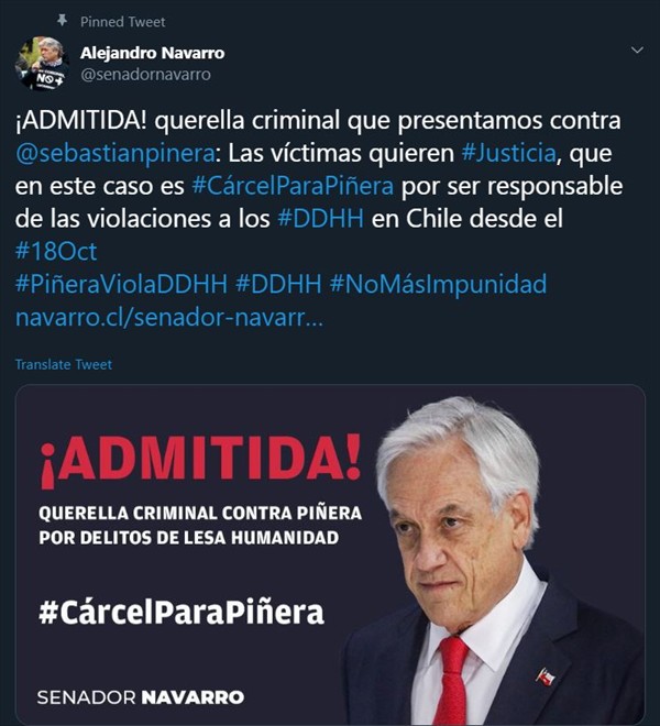 El 7º Juzgado de Garantía de Santiago admitió este martes la querella por delitos de lesa humanidad que interpuso el senador Alejandro Navarro (PRO) contra el Presidente Piñera.