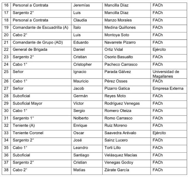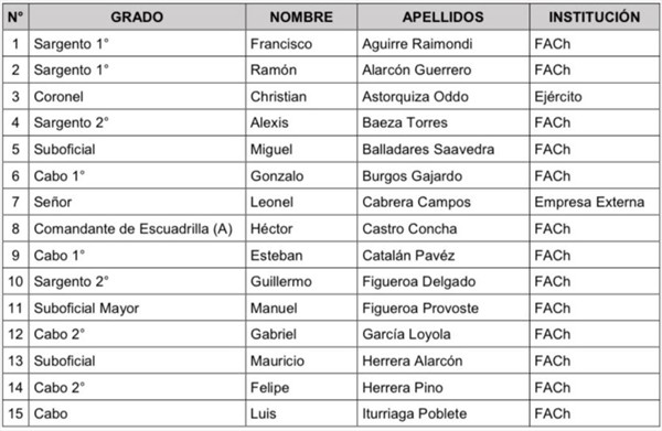 Recientemente la Fuerza Aérea de Chile publicó la lista de los 17 tripulantes y 21 pasajeros que viajaban en el Hércules C-130 siniestrado durante el lunes, cuando viajaba a la Antártica.