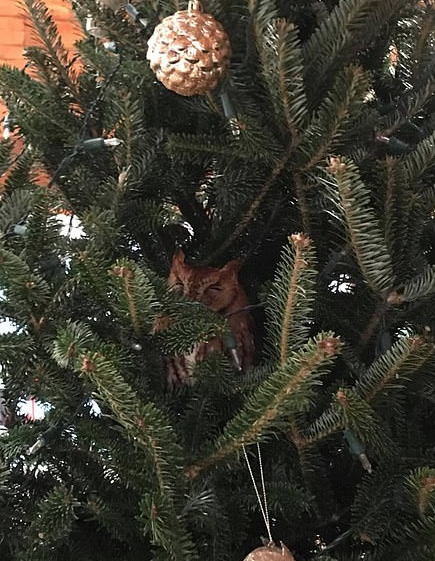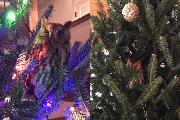 Katie acompañó a su hija hasta el árbol, que estaba decorado con muchas piezas navideñas, entre ellas varios búhos, pero lo que ella no esperaba es que una de esas supuestas piezas se girara y la mirara fijamente. Finalmente, no se trataba de un adorno navideño sino un búho de verdad.