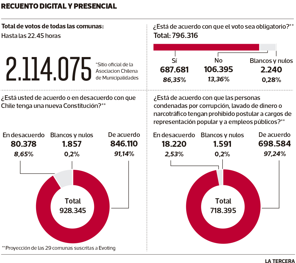 Según cifras entregadas por la Asociación Chilena de Municipalidades (AChM), anoche, hasta las 22 horas, se contabilizaban 2,1 millones de personas que votaron en un sistema inédito, no vinculante, habilitado con mesas presenciales, pero fundamentalmente por internet.