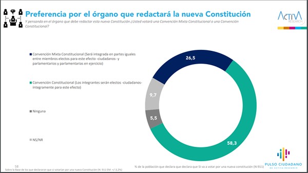 Sobre la preferencia por el órgano que redactará la nueva Constitución, el 58,3% apoya la Convención Constitucional (ciudadanos electos), mientras que el 26,5% respalda la Convención Mixta Constitucional (ciudadanos y parlamentarios en partes iguales).