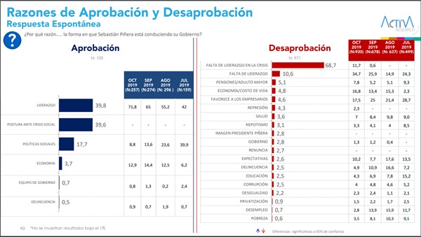 El 68,7% de los 1.159 consultados afirma que Piñera ha tenido falta de liderazgo en la crisis social que hace seis semanas atraviesa el país. Otros cuestionan sus medidas para las pensiones y el adulto mayor (5,1%), economía y costo de la vida (4,8%), un favorecimiento a los empresarios (4,8) y la represión a las manifestaciones (4,