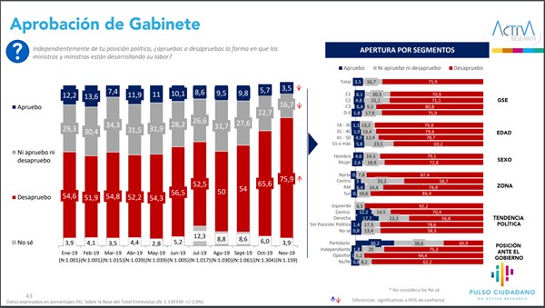 También aumentó la desaprobación hacia el Gabinete. El 75,9% rechaza la gestión de los ministros y ministras de Gobierno, mientras que el 3,5% respalda su actuar. En octubre se registró un 65,6% de desaprobación y un 5,7% de aprobación.