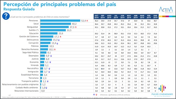 En el contexto del estallido social, los encuestados afirman que las pensiones (52,4%), la salud (40,2%) y la desigualdad (37,3%) son los principales problemas de Chile en estos momentos. A esto se suman los sueldos (33,5%), criterio que se sumó al listado durante el mes de noviembre.