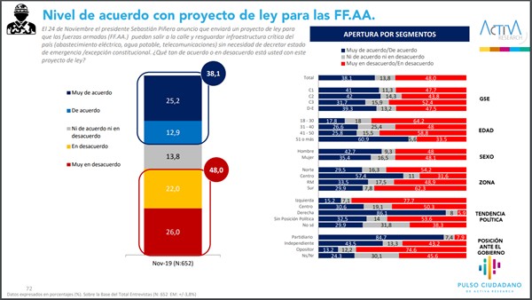 Los encuestados también respondieron acerca del proyecto propuesto por el Presidente Piñera para que las Fuerzas Armadas resguarden infraestructura crítica sin Estado de Excepción. El 38,1% apoya la medida del Mandatario, mientras que el 48% la rechaza.
