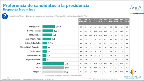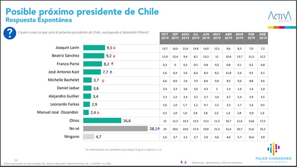 El panorama cambia ante la pregunta de quién será el próximo Presidente. Lavín encabeza las opciones con un 9,5%, seguido de Sánchez (9,2%), Parisi (8,2%) y José Antonio Kast (7,7%
