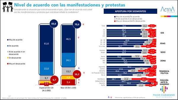 Los encuestados también opinaron sobre la ola de protestas que se ha producido en todo el país. La medición indica que el respaldo a las manifestaciones disminuyó de un 83,6% en octubre a un 70,6% en noviembre. La desaprobación, en cambio, aumentó del 6,7% al 16,2%.