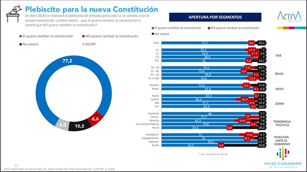 En cuanto al plebiscito de entrada para una nueva Constitución, el 77,2% afirma que votará que sí. Por otra parte, el 6,6% asegura que no apoyará una nueva Carta Magna y un 10,2% señala que no acudirá a votar.