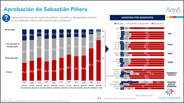 Este lunes se publicó la encuesta Pulso Ciudadano de Activa Research correspondiente al mes de noviembre. Según los resultados la desaprobación a Sebastián Piñera aumentó en 17 puntos, alcanzando el 78,1%. Y en cuanto al respaldo al presidente disminuyó del 9,1% en octubre a 4,6% el mes pasado.
