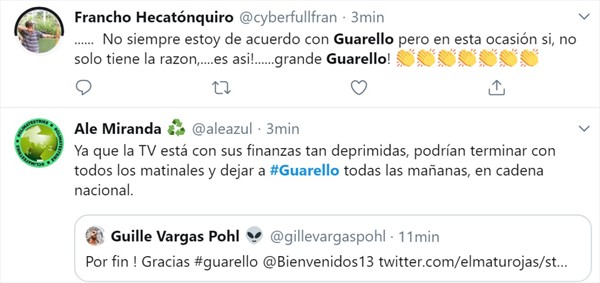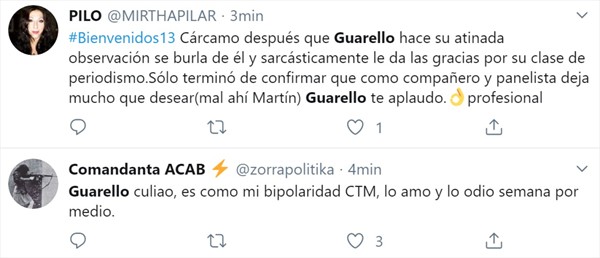Lejos de apagar el fuego con agua, Guarello continuó con que: «no se le da el tratamiento que se le da a esta persona, que es un enfermo, que no es nada. Dejémoslo en paz, él solo puede terminar mal, él lo único que ha conseguido es comerse un plato de comida y tomarse una cerveza».