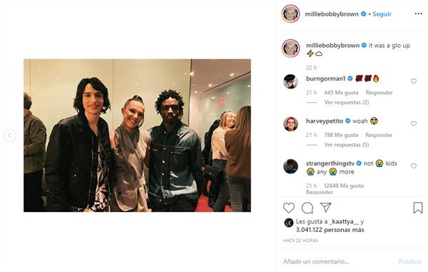 En esta se ve a Millie Bobby Brown junto a su compañero Finn Wolfhard y Caleb McLaughlin, con una foto de los comienzos de la serie y una de enero de 2020 en California.