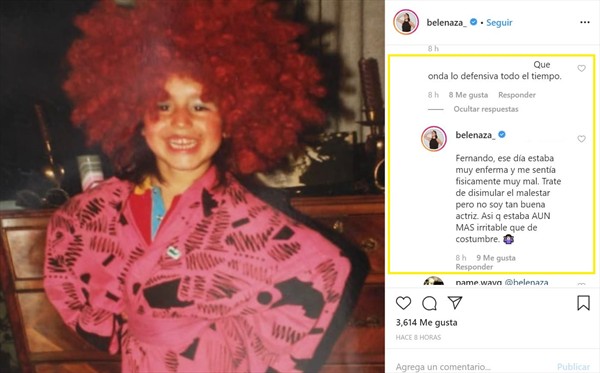 La actitud de la humorista fue bastante comentada en redes sociales, donde la mayoría la criticó. Incluso un usuario le comentó en Instagram sobre esto, a lo que «Belenaza» se justificó: «ese día estaba muy enferma y me sentía físicamente muy mal. Traté de disimular el malestar, pero no soy tan buena actriz. Así que estaba aún más irritable que de costumbre«, aseguró.
