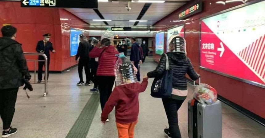 Usuarios han compartido diversas fotografías en las redes sociales, donde se ven a adultos y niños con sus cabezas cubiertas de plástico o incluso con cascos de moto para protegerse del virus.