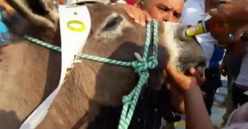 El hecho sucedió en el Festival del Mango, en Colombia, donde la protagonista del maltrato quiso «premiar» al animal por ganar una carrera. La mujer quiso darle de beber cerveza al burro, y como este se negó, le introdujo el botellín en la nariz.