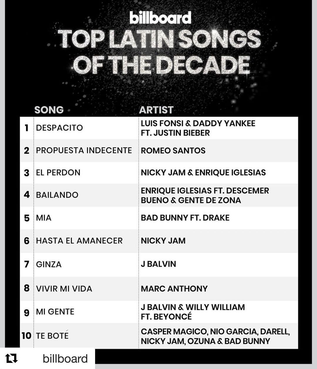 Si bien aún sigue el debate si con el 2020 se termina la década o comienza una nueva, distintos medios hicieron sus recuentos sobre lo que ha pasado en los últimos 10 años. Por ejemplo Billboard que no solo eligió las 10 canciones más exitosas de la década, también dedicó una categoría especial a la música latina.