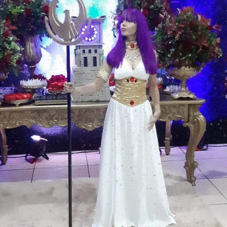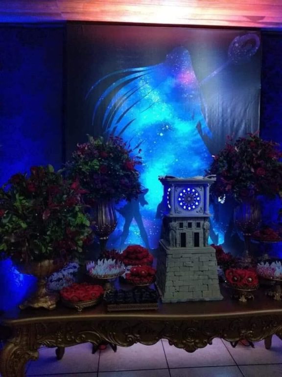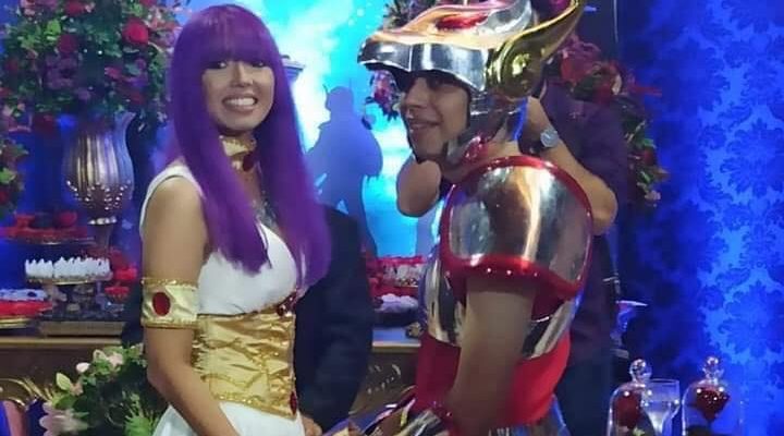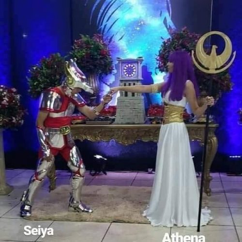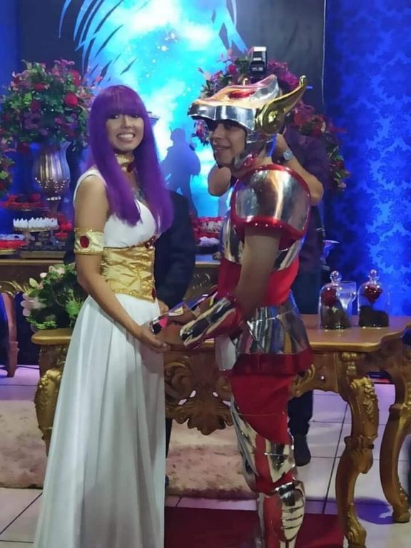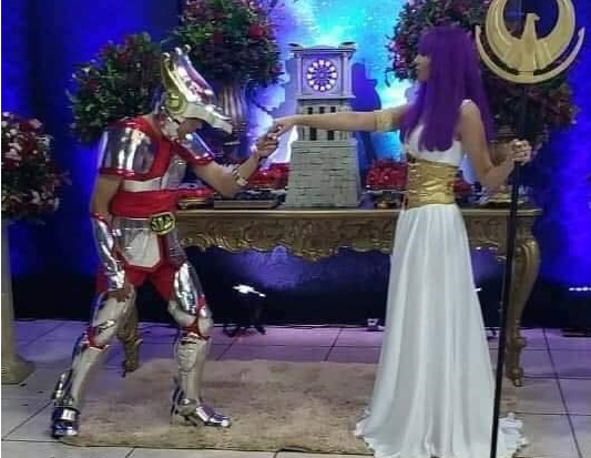 El ambiente estaba inspirado en en esto también, había flores y un monumento a escala del reloj del Santuario, estructura emblemática de la era de “Las 12 Casas” y ellos estaban disfrazados de los dos protagonistas del manga: la princesa Atena y Seiya, el caballero de Pegaso.