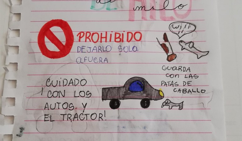 «Cuidados de Milo» se titula el compendio de dos hojas con instrucciones, que cuenta con dibujos y advertencias. Algunos de ellas son: «Prohibido dejarlo solo afuera», «si come cualquier cosa vomita» y «Milo no es un buen nadador».