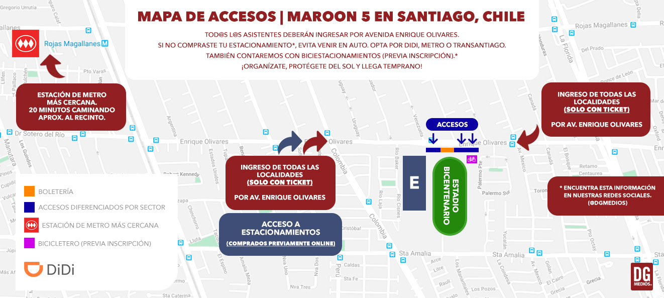 Este viernes 28 de febrero Maroon 5 se presentará en Estadio Bicentenario de La Florida tras su paso por Viña (jueves 27) y como sabemos que los fanáticos nacionales no puedes más de las ansias por verlos, acá les dejamos las importantes recomendaciones compartidas por la productora DG Medios.