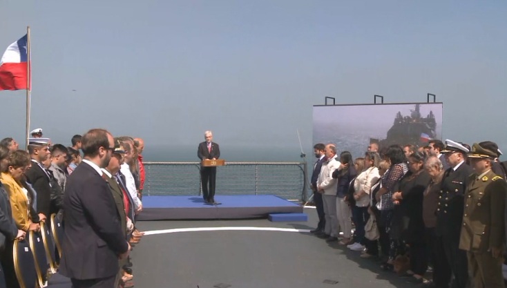«Todos los chilenos recordamos como si fuera hoy esa madrugada del 27 de febrero. Yo recuerdo haber estado ese mismo día aquí, recuerdo haber estado en un edificio muy famoso, Alto Río, y escuchamos los gritos desesperados de las víctimas que aún estaban atrapadas», partió  diciendo el presidente en la ceremonia que se llevó a cabo a bordo de la nave de la  Armada de Chile “Piloto Pardo”, en la bahía de Talcahuano.