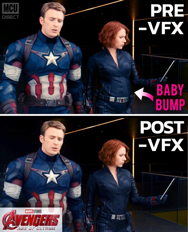 En la captura la artista se ve usando el traje de Black Widow en plena grabación de la película con una notoria pancita, al lado de Capitán América (Chris Evans).
