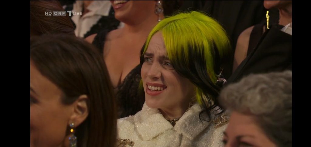 Esta historia partió porque Cinemark subió a su perfil una foto de la cantante Billie Eilish, durante la ceremonia, donde luce una expresión de desaprobación, la que rápidamente se convirtió en meme.